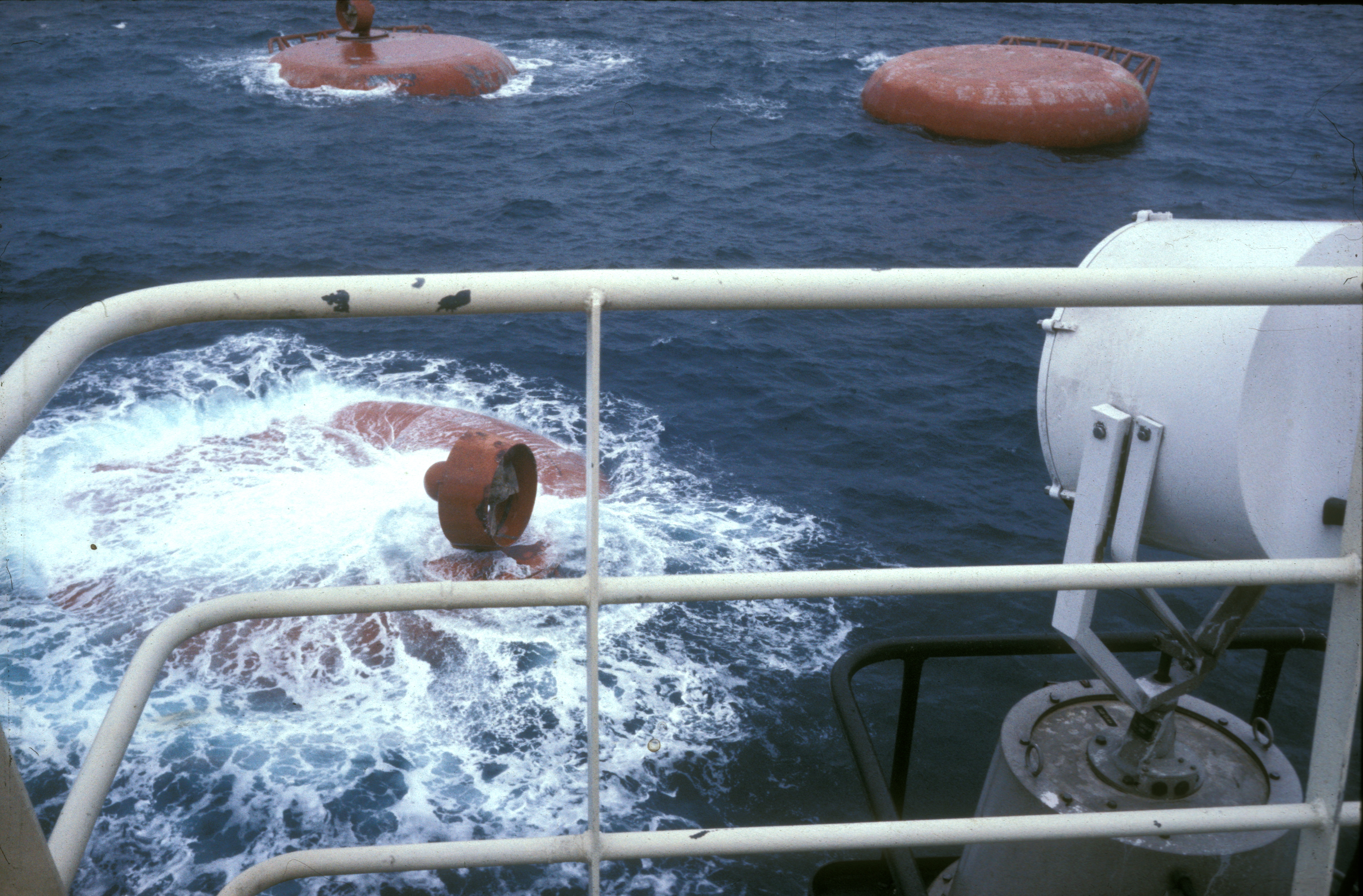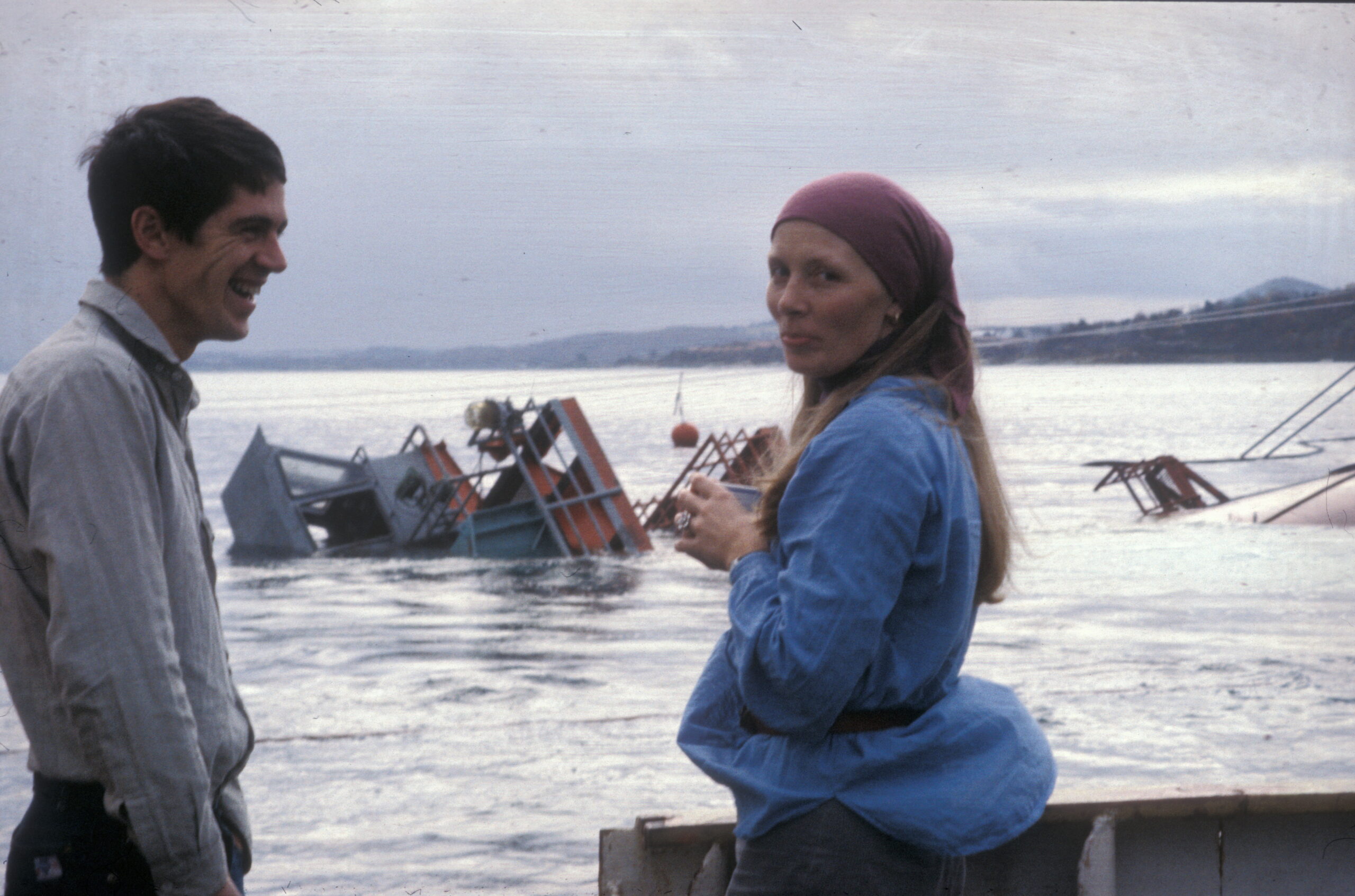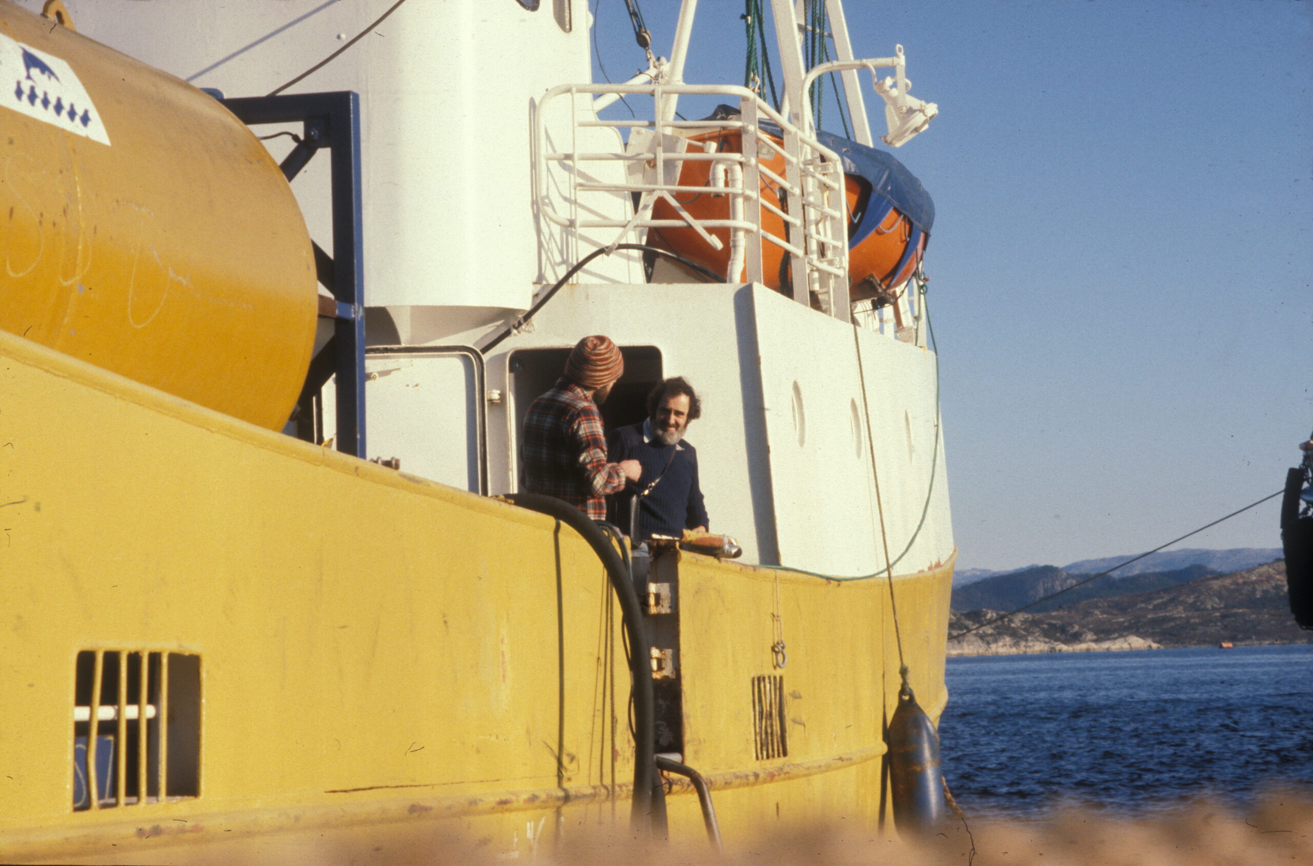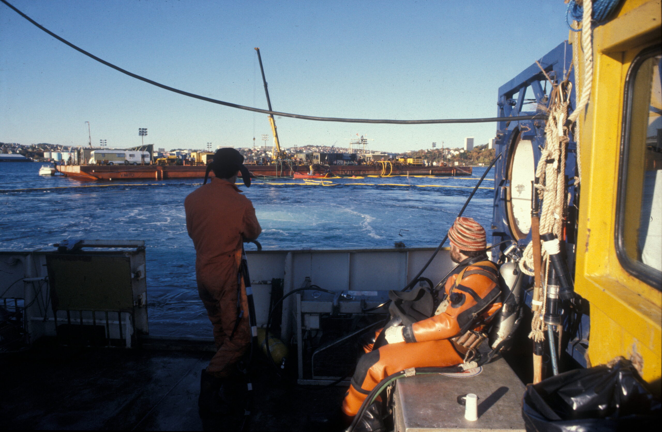 Første forsøk på å snu Alexander L. Kielland. Ombord på Sirefjord»». Stian Reksten til venstre. I bakgrunnen ser en lekteren «Vimito» hvor Scot Kobus hadde fått bygget et stillas hvorfra han kunne følge hele operasjonen. (Foto: Børre Børretzen/Norsk Oljemuseum)