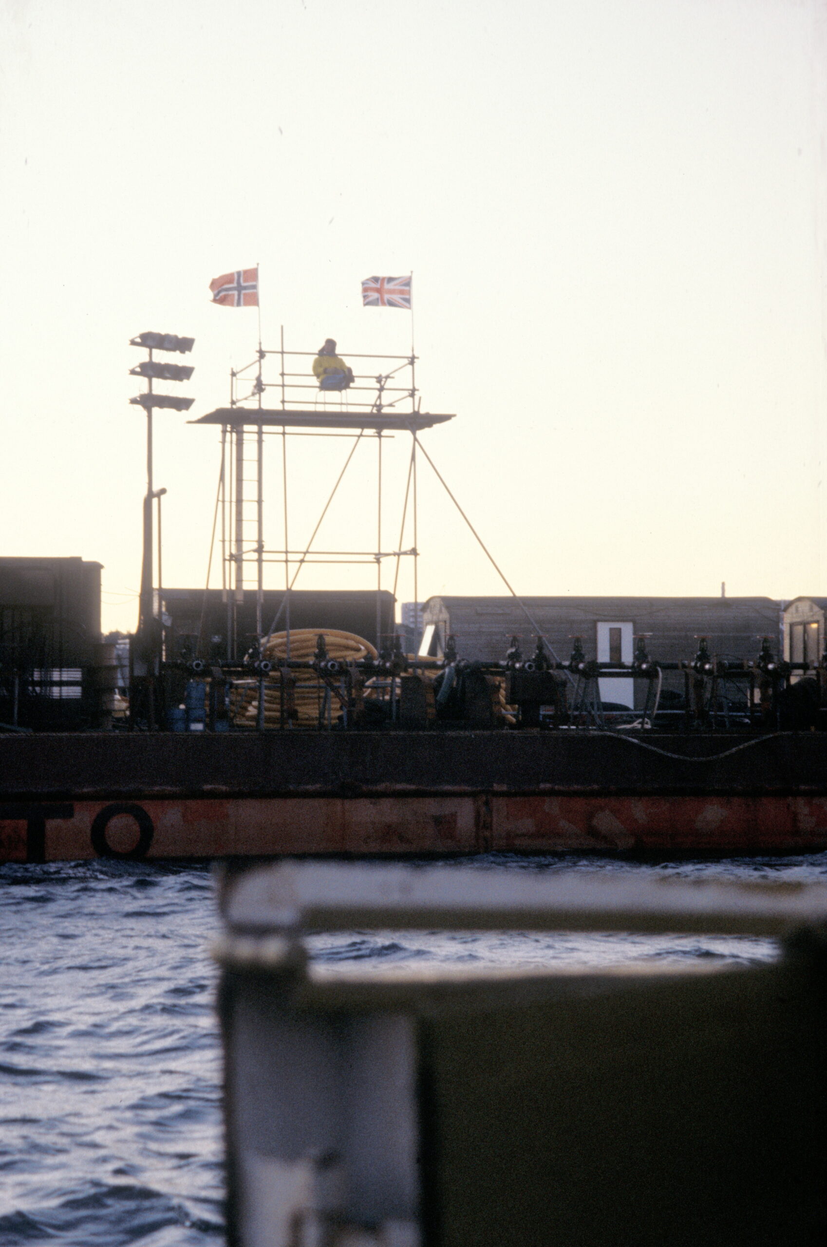 Første forsøk på å snu Alexander L. Kielland. Scot Kobus som ledet operasjonen overvåket arbeidet fra toppen av et stillas på lekteren «Vimito» . Over stillaset ses et norsk flagg, og et britisk flagg. På lekteren sto det kompressorer for luft og vann som skulle brukes til snu plattformen. (Foto: Børre Børretzen/Norsk Oljemuseum)
