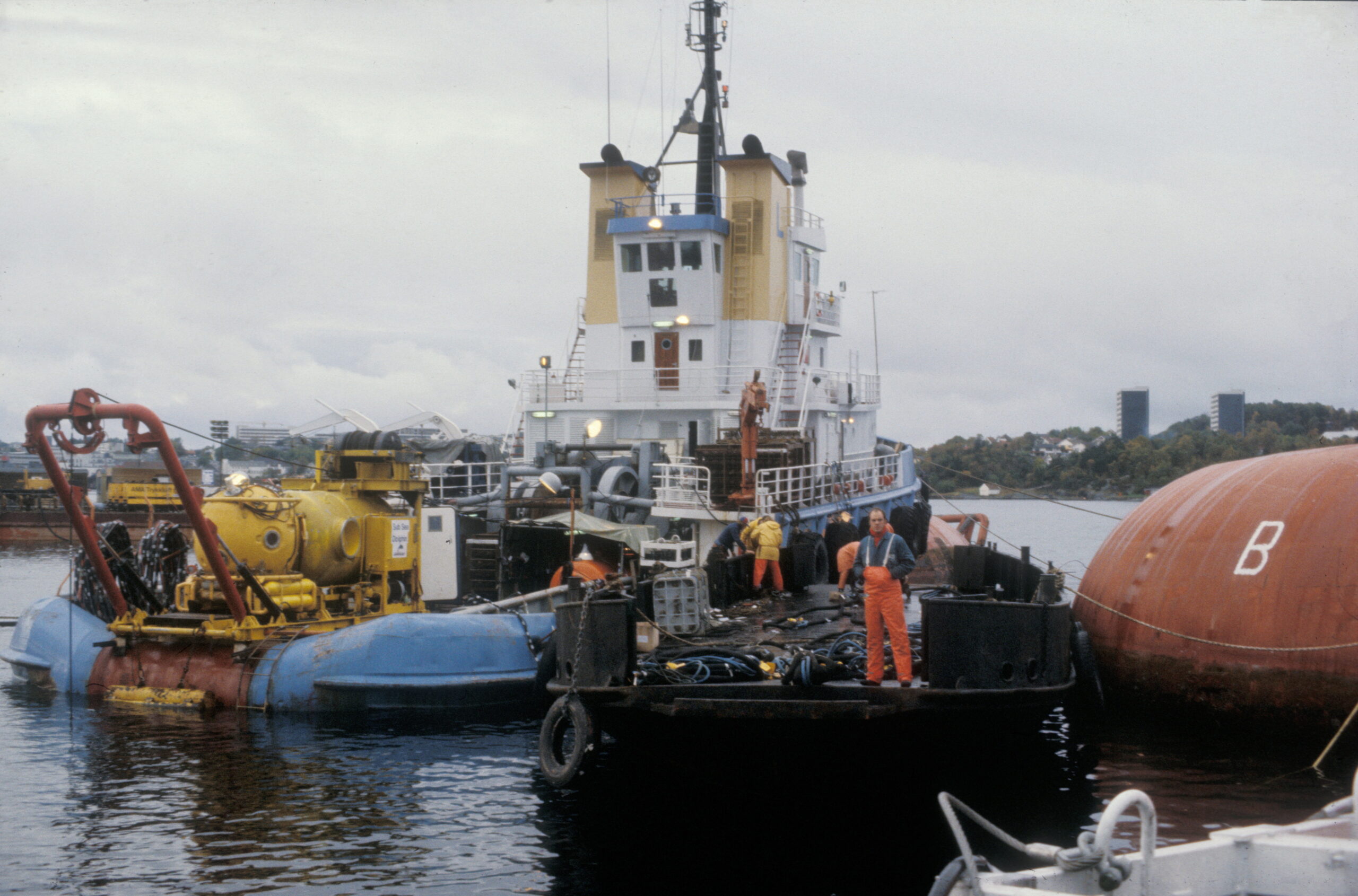 Første snuforsøk av Alexander L. Kielland i Gandsfjorden. Skipet «Lunde Senior»» med 3X sitt Ulis -kammer og dykkeklokkesysttem. (Foto: Børre Børretzen/Norsk Oljemuseum)