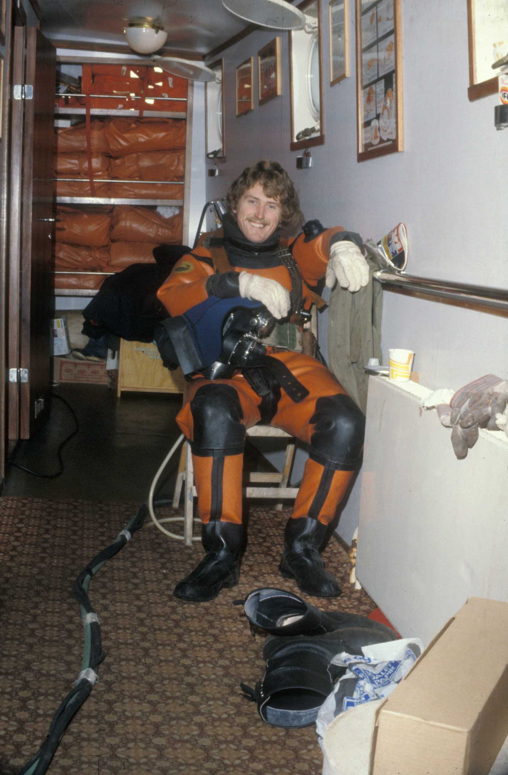 Første forsøk på å snu Alexander L. Kielland. Dykkere tar en liten pause ombord på skipet «Sirafjord». Michael til venstre og Stian Reksten til høyre. (Foto: Børre Børretzen/Norsk Oljemuseum)