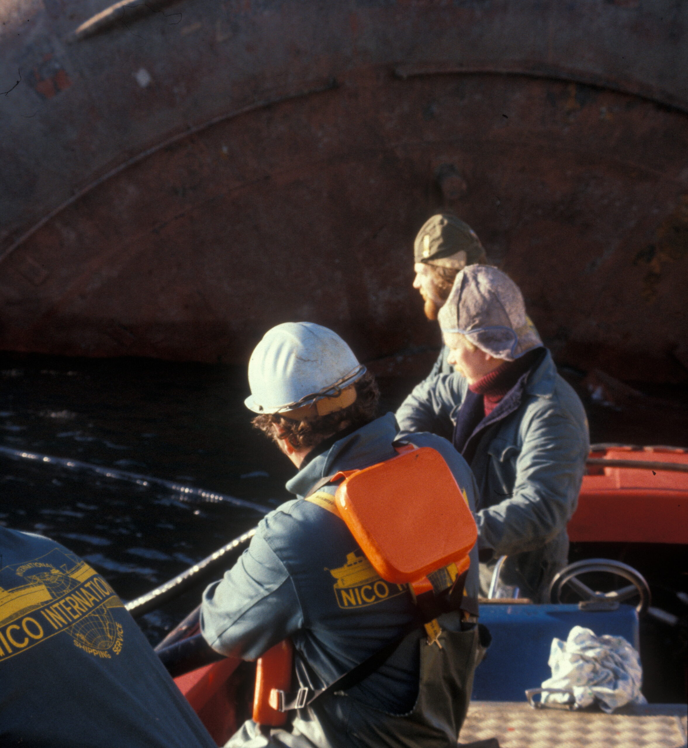 Sjauere med overflatearbeid under dykkeoperasjoner i forbindelse med første forsøk påå snu Alexander L. Kielland. Arbeidstøy vist med logoen til «Nico International shipping service». (Foto: Børre Børretzen/Norsk Oljemuseum)