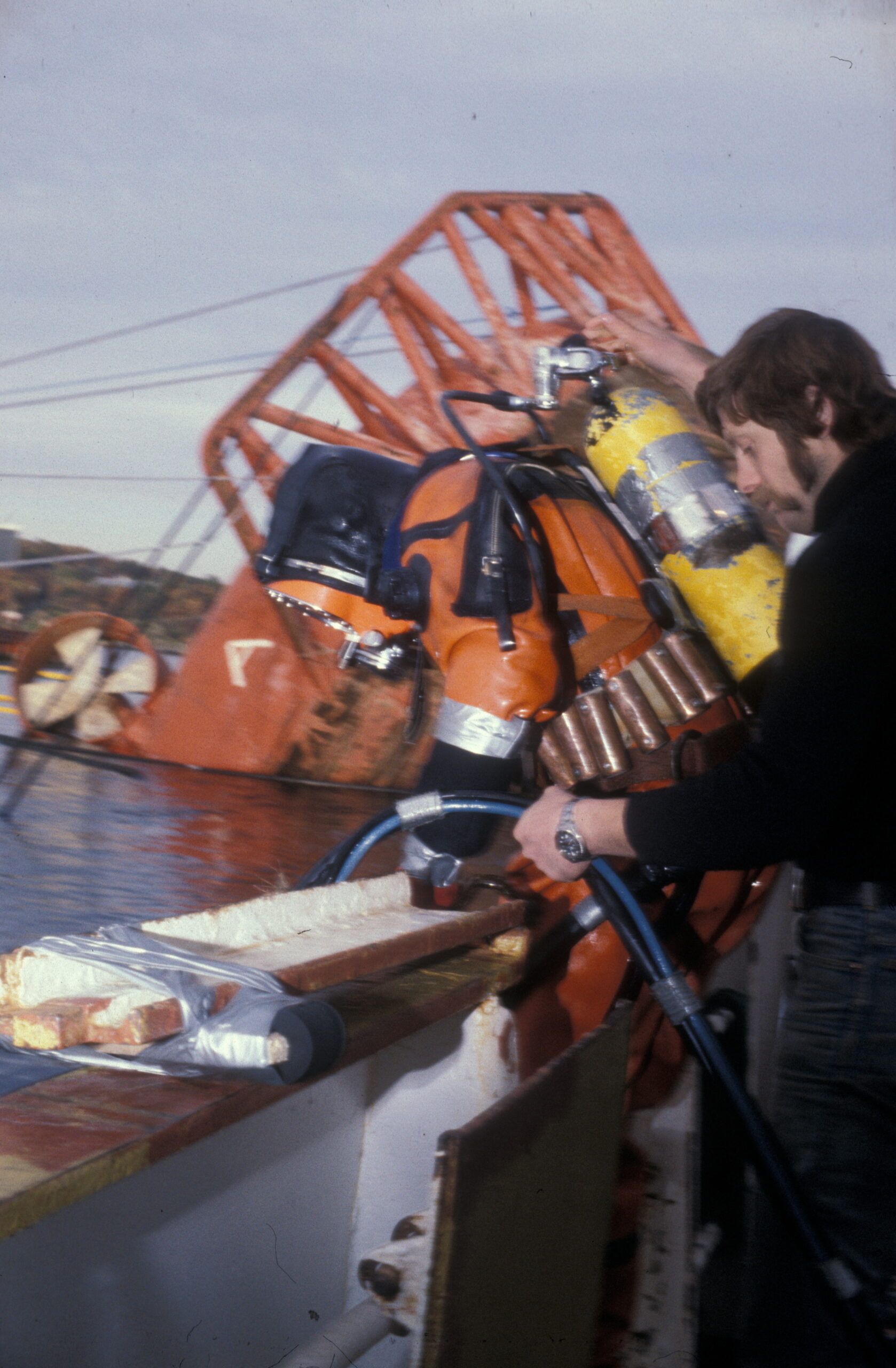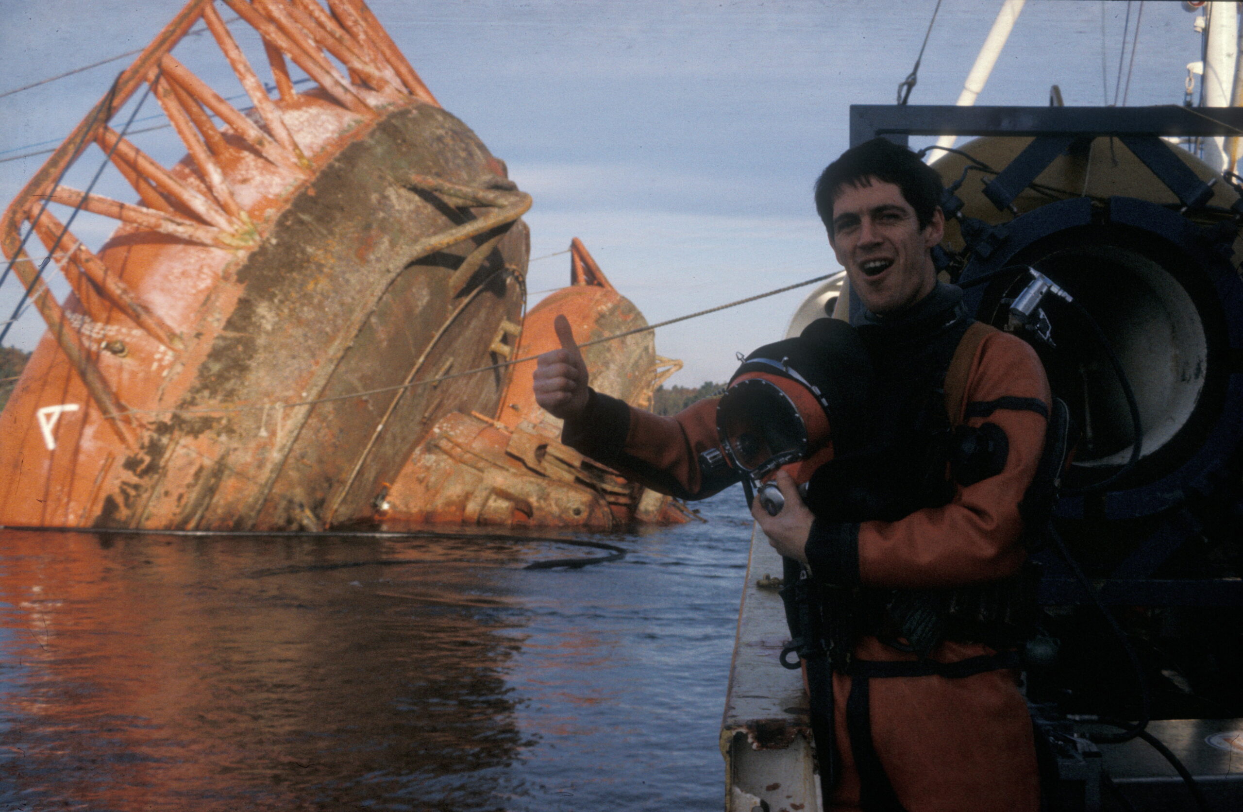 Dykker på vei opp på «Sirafjord» etter å ha dykket under første forsøket på å snu Alexander L. Kielland. (Foto: Børre Børretzen/Norsk Oljemuseum)