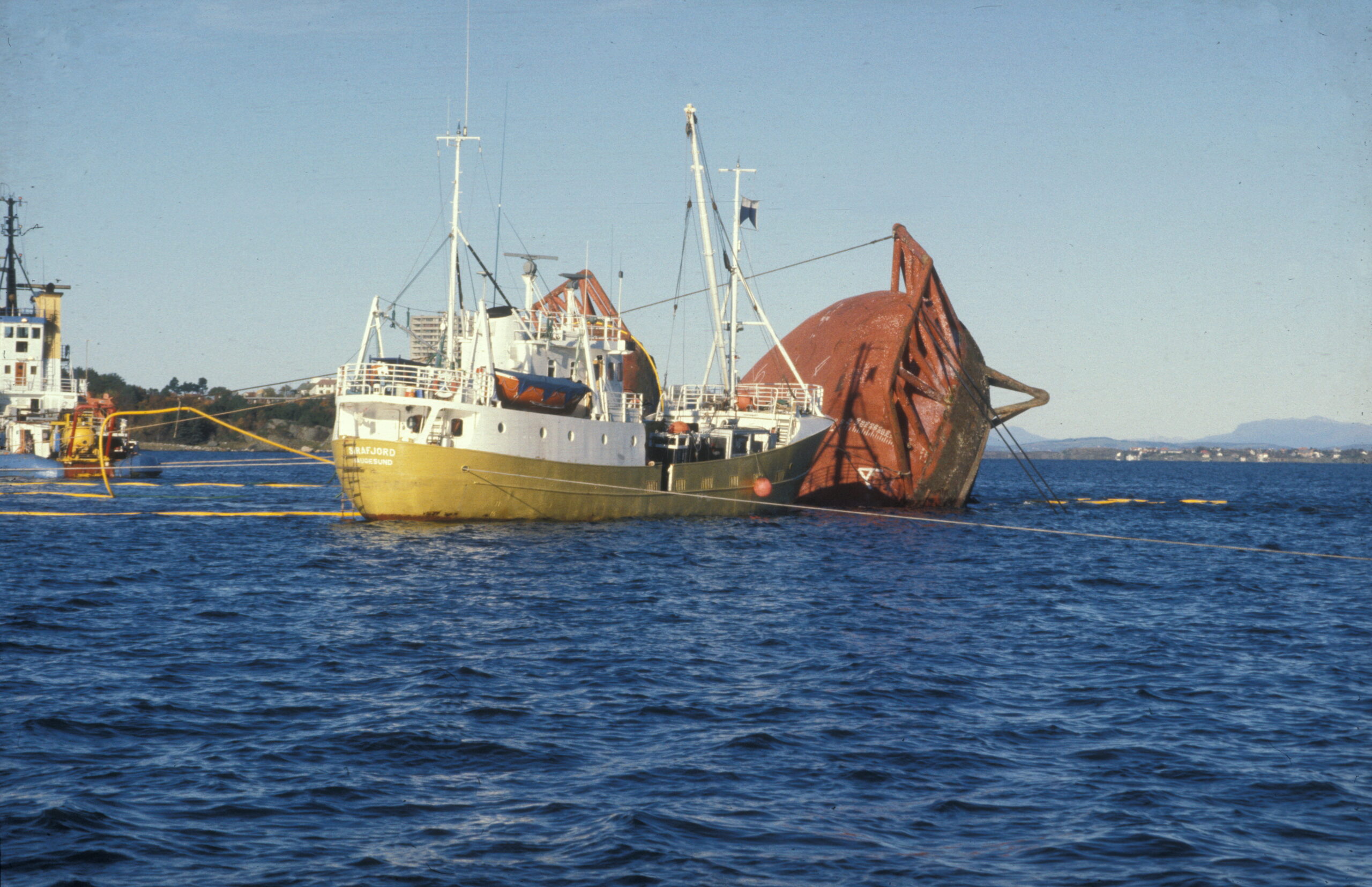 Første forsøk på å snu Alexander L. Kielland. Skipet «Sirafjord» var med på arbeidet og var den eneste som var utstyrt med trykkammer. I sjøen ses luftslanger til ballasttankene. (Foto: Børre Børretzen/Norsk Oljemuseum)