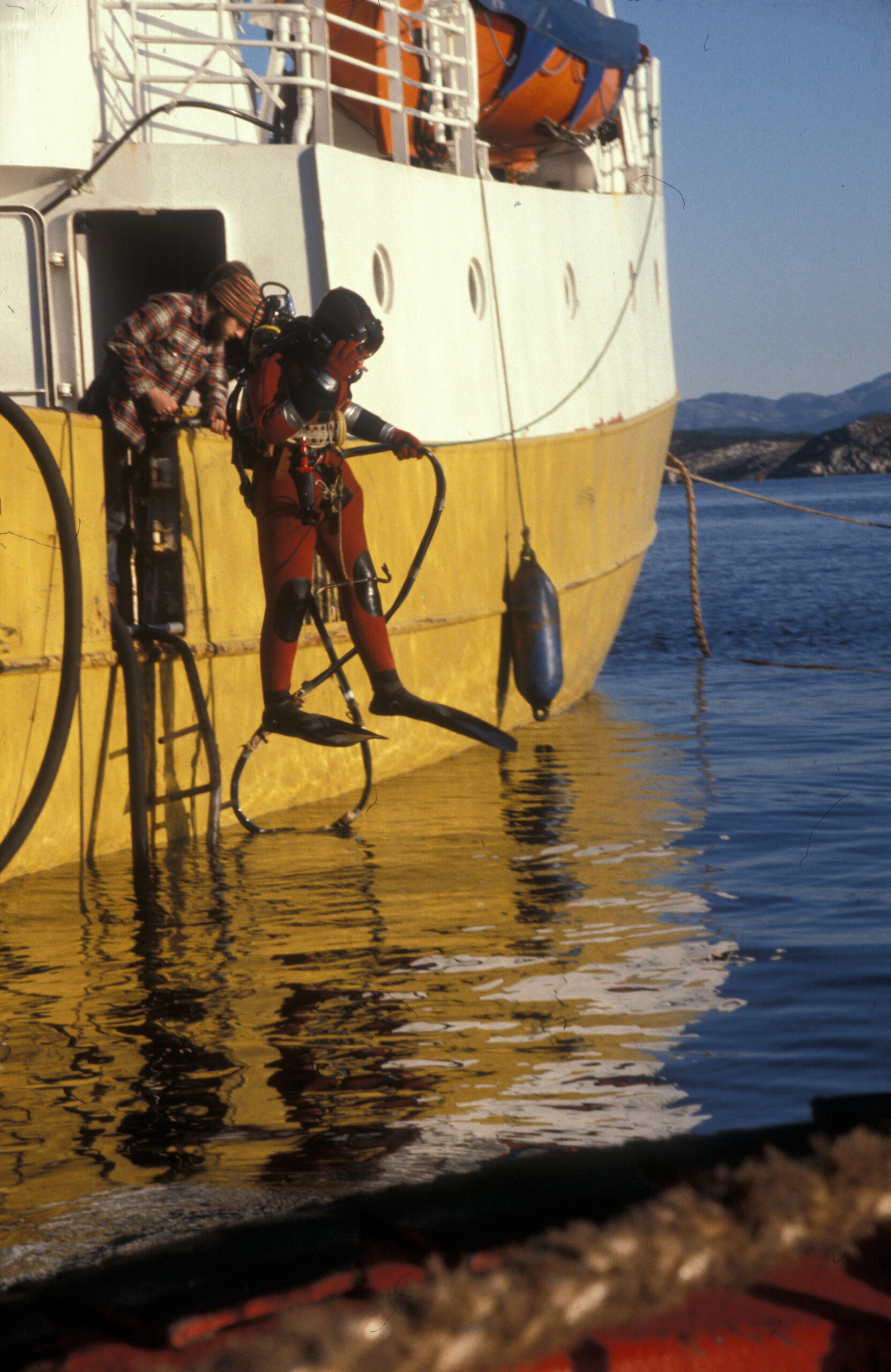 Første forsøk på å snu Alexander L. Kielland. En dykker på vei ned i sjøen fra skipet «Sirafjord». (Foto: Børre Børretzen/Norsk Oljemuseum)