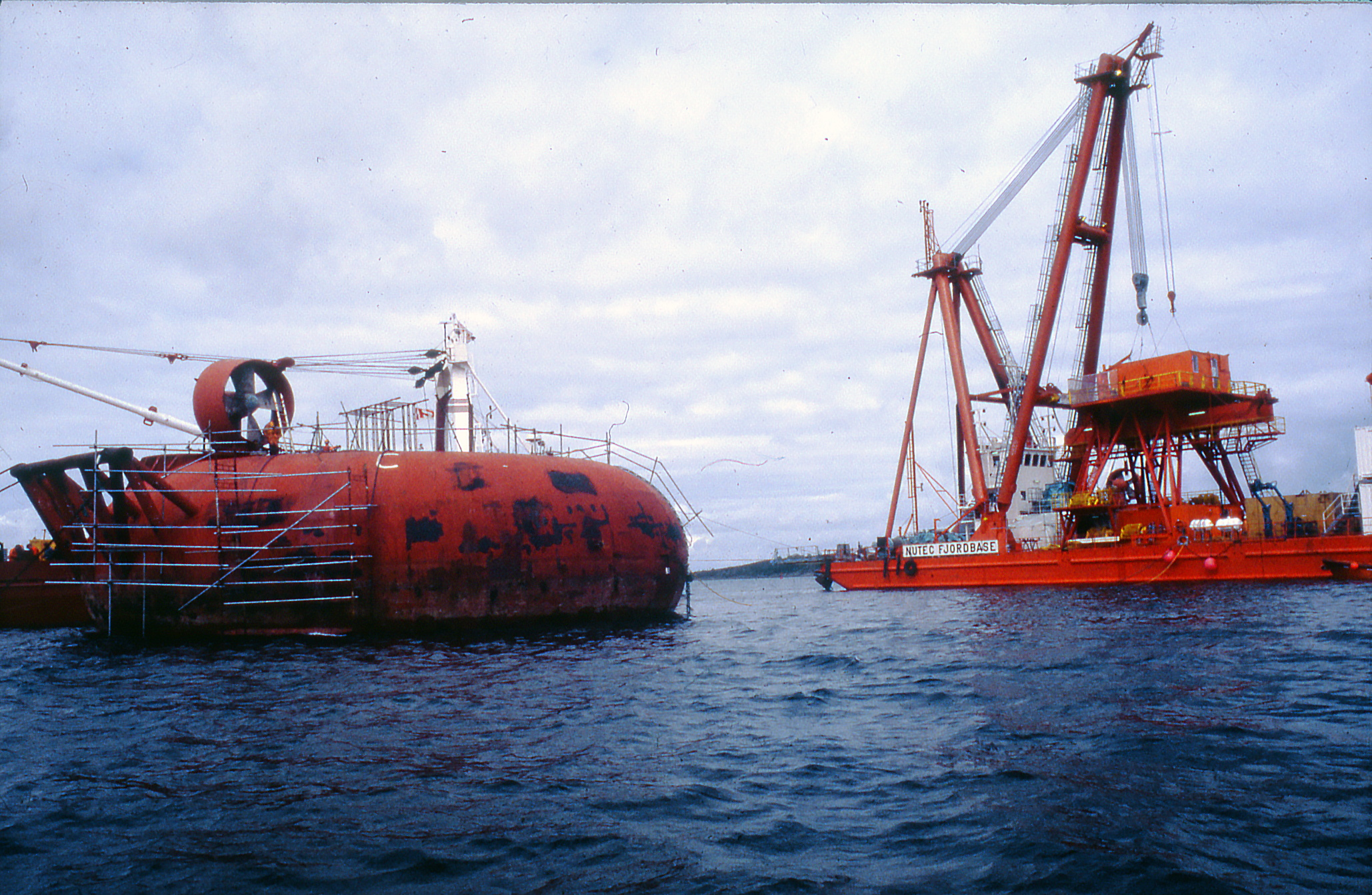 Den ene pongtongen er kommet opp av vannet under det første forsøket på å snu plattformen. Lengre kom den ikke og forsøket ble gitt opp. Skipet «Lunde Senior» i bakgrunnen. Foto: (Børre Børretzen/Norsk Oljemuseum)